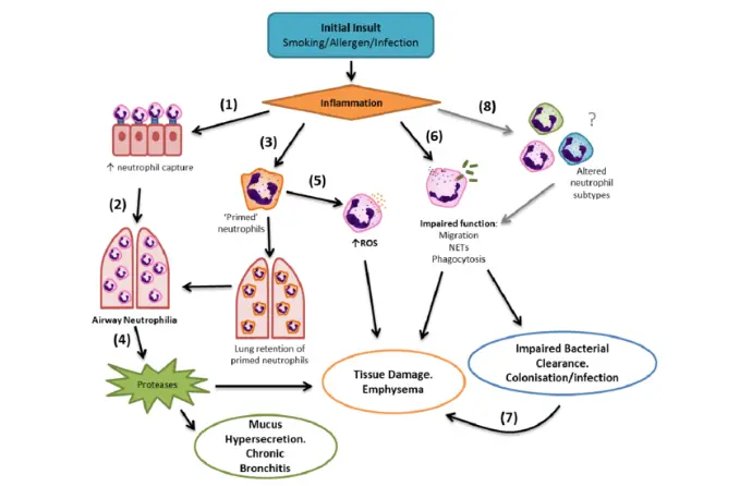 Leads to mucosal edema (swelling of the airway lining), increased mucus production (often thick and tenacious), and shedding of epithelial cells.